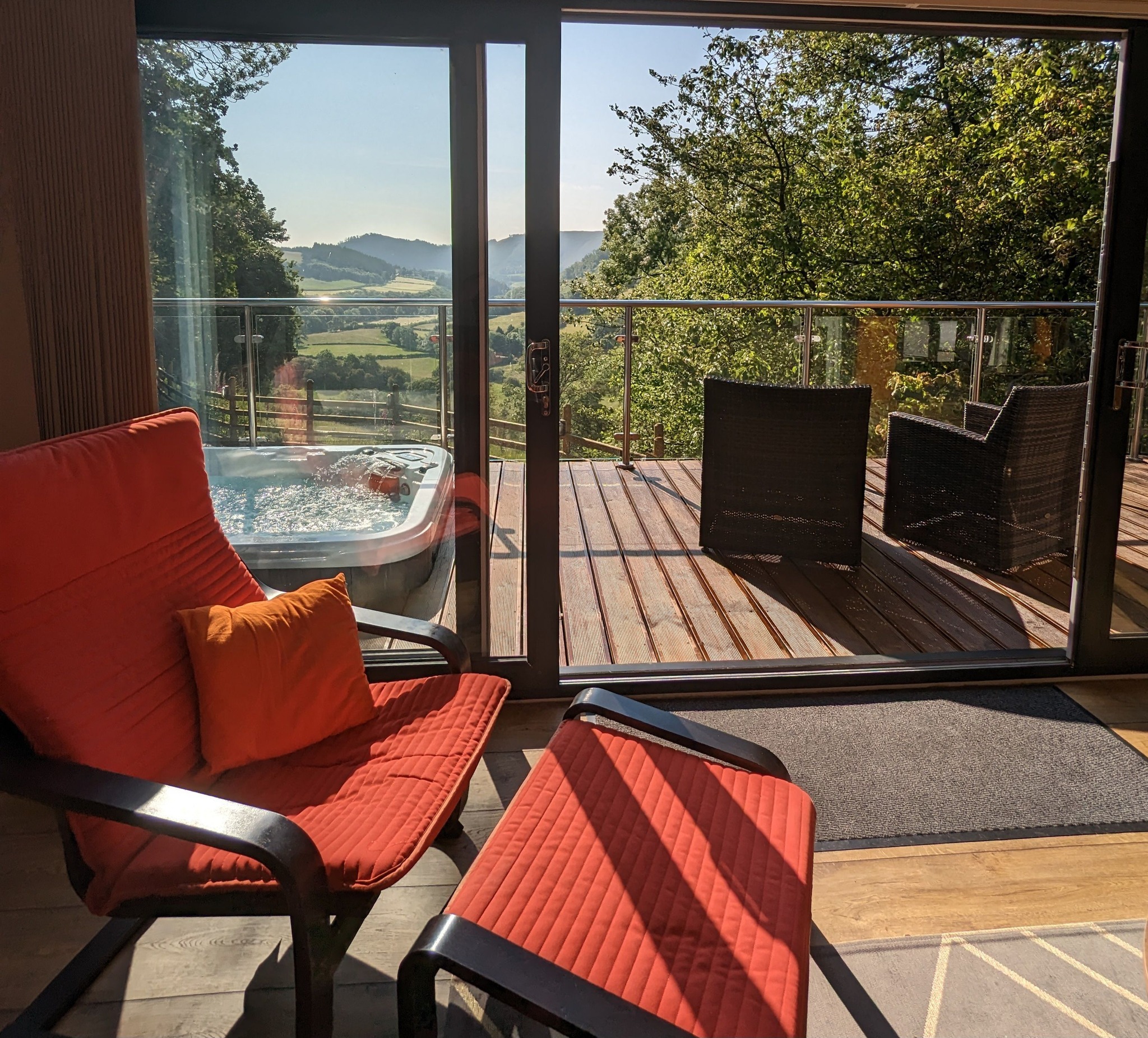 Escape the ordinary and indulge in a stay at Valley View, just 6 miles from Llangollen. Our luxury cabin sleeps 2. Soak in the hot tub and enjoy the stunning valley views. Wake up to the sound of birds singing and dine alfresco on the balcony. With floor to ceiling windows, an abundance of sunlight, Valley View is the perfect place to reconnect. Do as little or as much as you like. Gaze at the stars. Experience. Explore. Discover. Book your next adventure with Dee Valley Breaks.